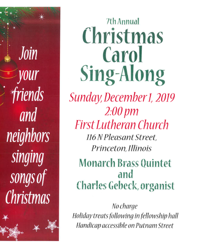 Join your friends and neighbors singing songs of Christmas - Here is your opportunity to sing Christmas carols you know and love. Joining us this season is The Monarch Brass Quintet and Charles Gebeck, organist